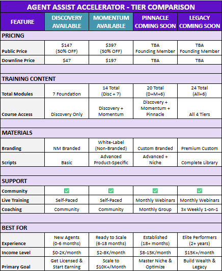 14 training modules (ALL of Discovery PLUS 7 advanced Momentum modules) that transform you from "figuring it out" to "running a professional operation." Master ongoing compliance, multi-state licensing, advanced client resources, strategic sales systems, and business growth—all with white-label ready materials.